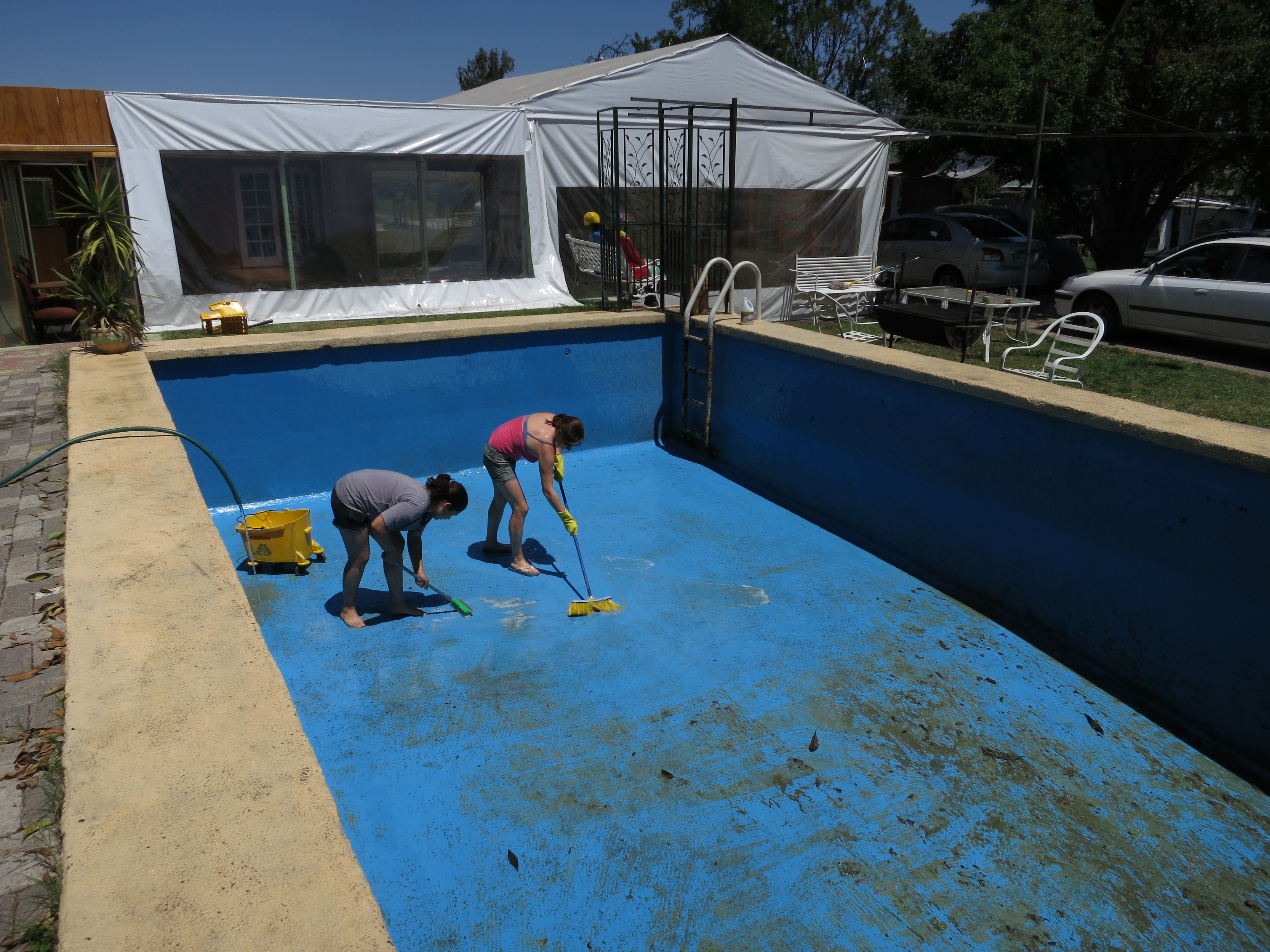 After a week in Santiago with temperatures rising slowly by the day, Nelson thought it was time to clean the pool after a winter of collecting all sorts of vegetation, animals and bacteria. I wondered why the pool was left full for the winter and there is a very good reason behind it. It protects the pool from cracking and fracturing in the event of an earthquake. This seemed to be common knowledge for Chileans who live in earthquake prone areas. So without further a due we drained the pool and removed the crap with the help of the ladies and Nelson’s son, Nelson. When that was complete, we engaged the women into cleaning mode :) while the chaps tapped into a beer and smoke while taking the picture above. Not quite true as after the short break we took to the pool and started scrubbing! Hard work as it took a while in the blazing sun to get it looking like new, but it was worth it.