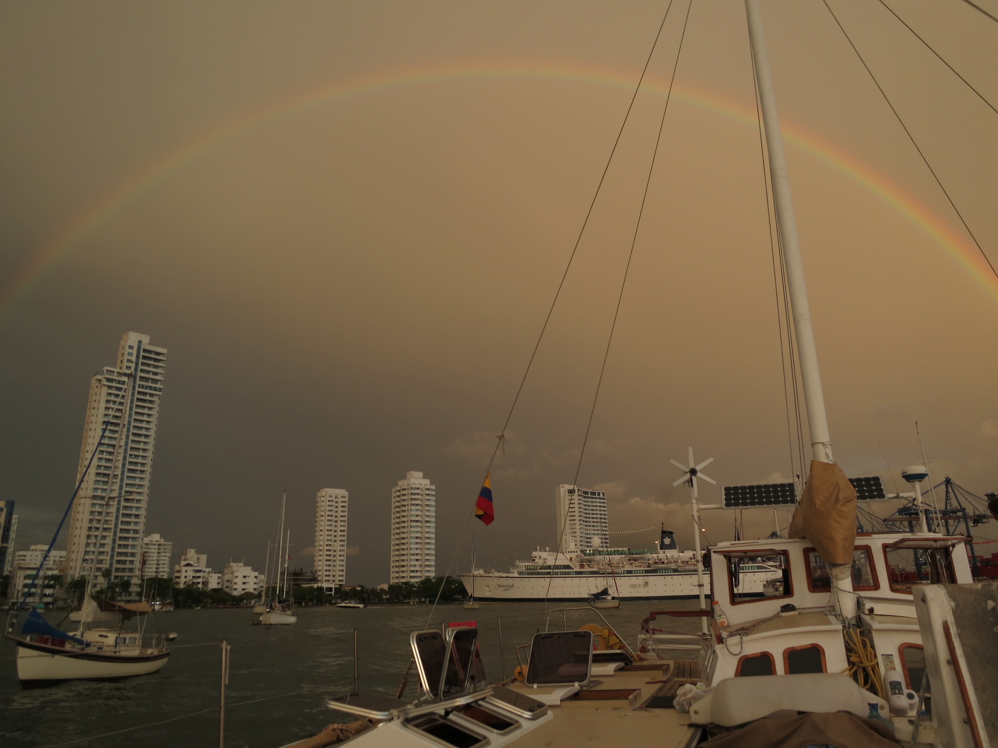 Over the weekend we dropped the outboard engines once again and cruised with the guys to chill and swim in the fresher waters just outside of harbor. We also stocked up on some pristine clean water by turning the osmosis water treatment rig on while we were there. We even had a visitor on-board, a pelican who was very interested in the boat and so decided to perch right at the front to get a better view. It was a good day and a nice change of scene from the marina. The evening followed with a great pizza and a rainbow that just looked incredible.