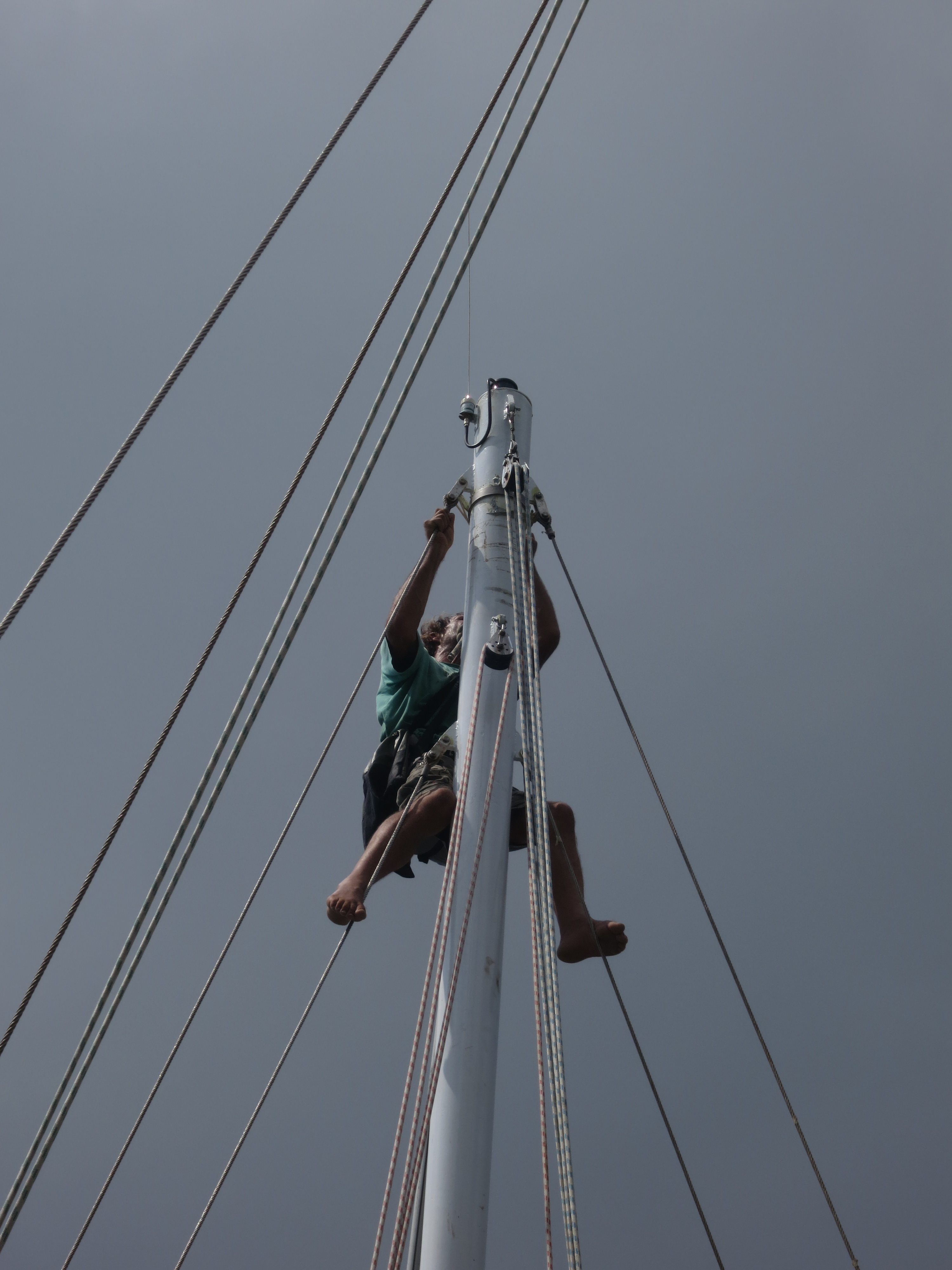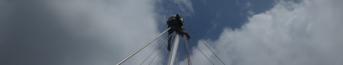 Friday morning we woke up just before the crack of dawn in hope that there would be less traffic surrounding the marina so that Coen could climb up the mast without being thrown around like a cowboy trying to hold on to a bull. We established the day before that we had a new problem with the mast. The new bracket that the fore-stay attaches to – that Coen had made for him – started to slip down the mast as we were tightening the fore-stay. Not good. We even took an angle-grinder twice to shorten the fore-stay before realising what was going on, so we might have cut it too short already. The message was clear; we had to somehow move the clamp back up and think of a way to keep it there. It seemed that the new clamp was a tad too big and it obviously wasn’t tightening properly.